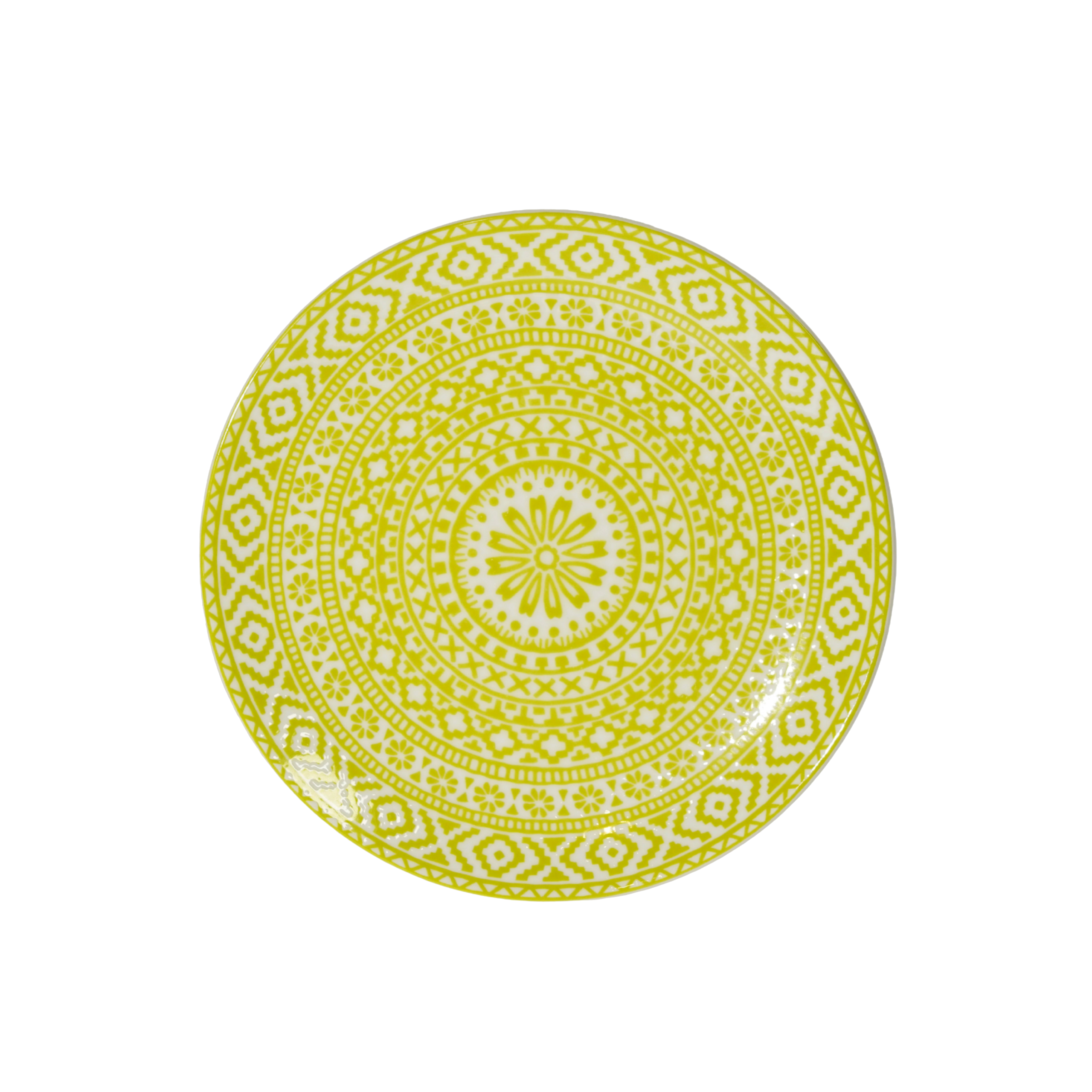 The 8" Honey Casablanca Plate features a vibrant lime-yellow pattern that brings a bold, artistic energy to any table. Its intricate Moroccan-inspired design is made of repeating circles, delicate flowers, and geometric shapes. This eye-catching piece uses a styled layout to create a colorful look perfect for weddings, corporate events, and more.