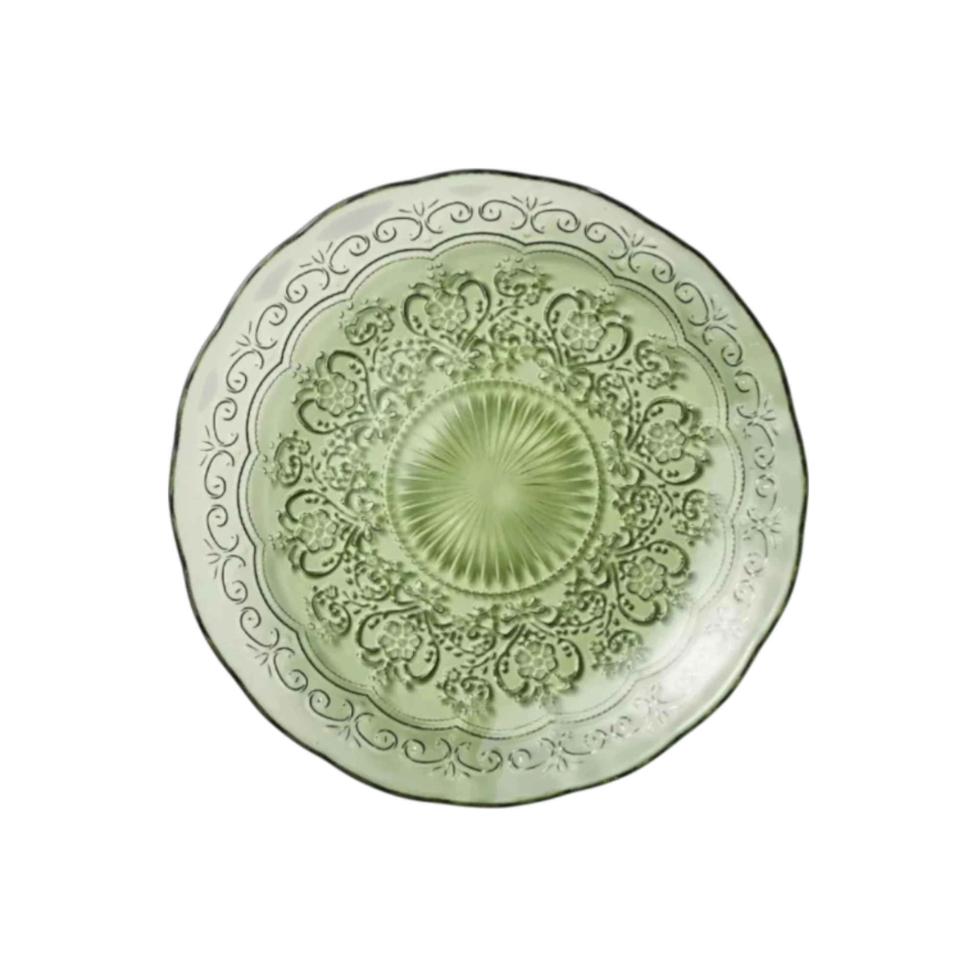 Add a touch of garden-inspired design to your table with the Maria Fern Salad Plate, featuring a refreshing tint and intricate vintage patterns. This green glass plate is defined by its ornate floral medallion and delicate scalloped edges, making it a standout piece for weddings, showers, or corporate gatherings. Designed lasting quality, this glass plate brings a luminous, durable feel to any tablescape.